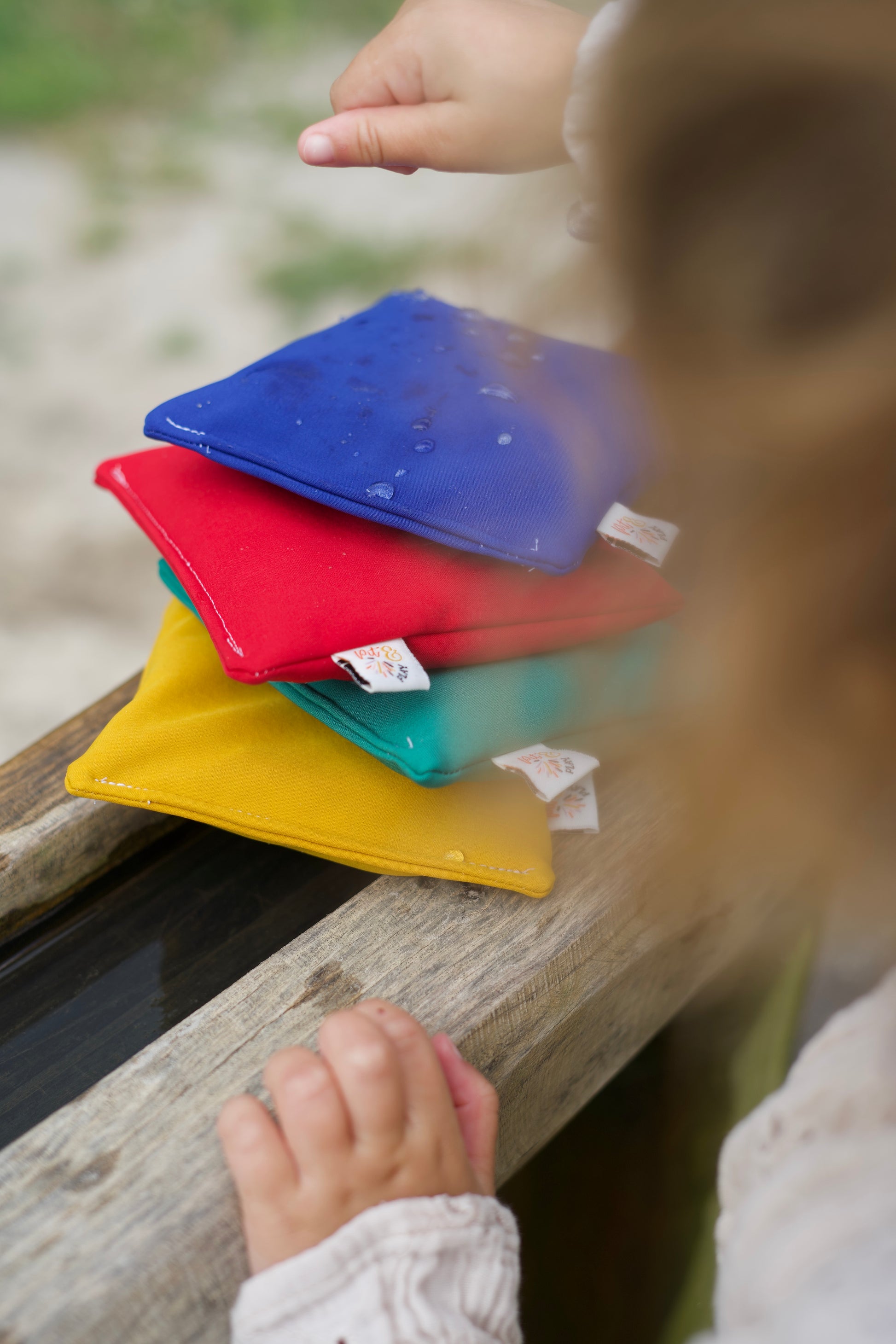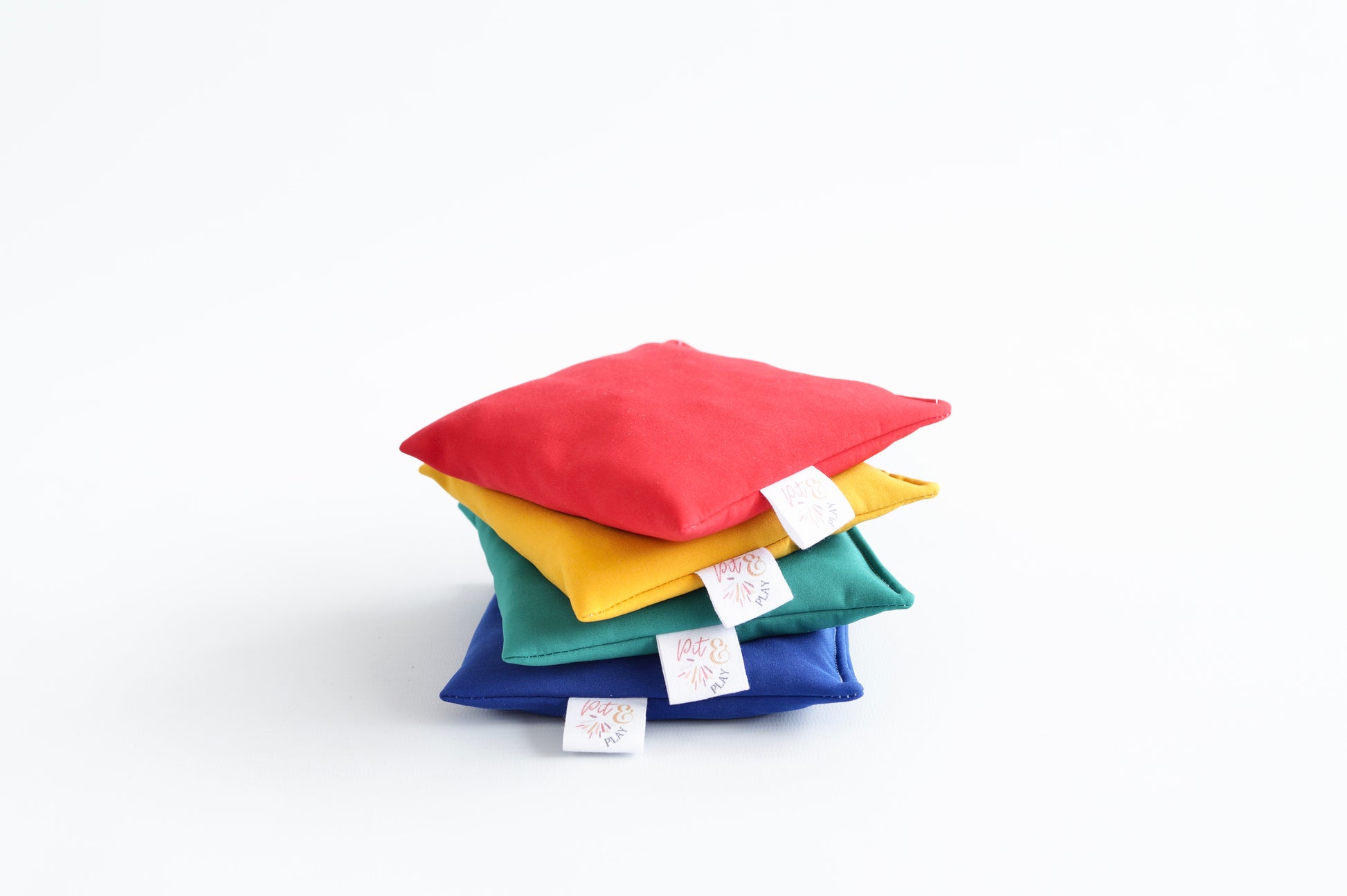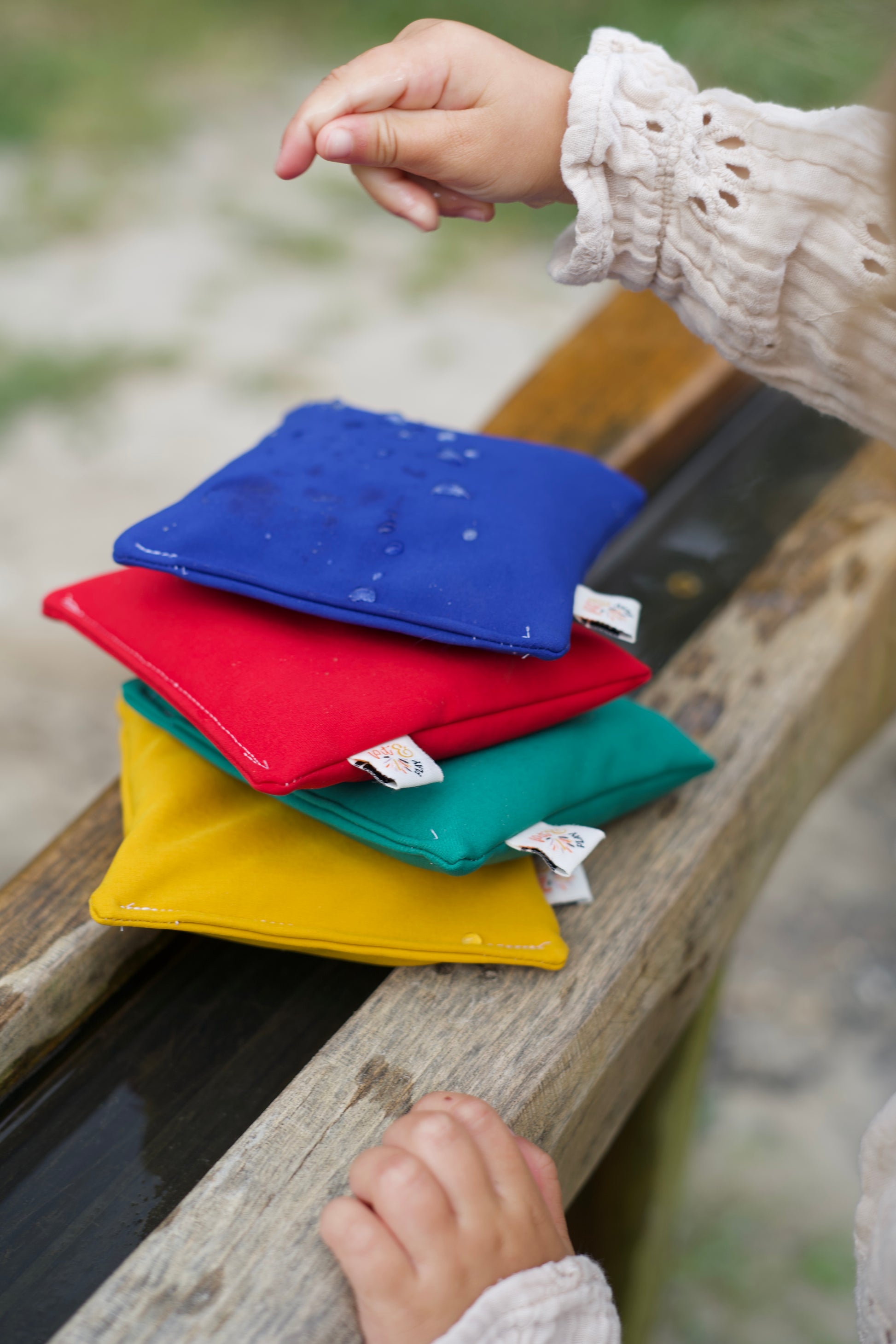 Een pittenzakjes set van 4 waterafstotende pittenzakjes in de heldere regenboogkleuren rood, blauw, groen en geel. Deze zakjes combineren sensorisch speelgoed met praktisch gemak – speciaal ontwikkeld voor dagelijks, intensief gebruik in omgevingen waar meerdere kinderen spelen.